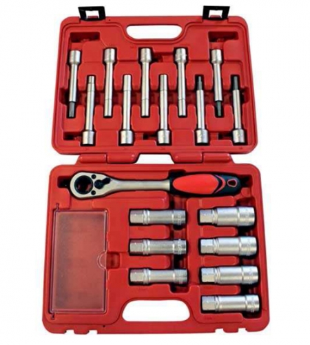 (170,29 € inkl. Mwst) zzgl. VersandDas Superkit: - zum Gegenhalten der Kolbenstange bei gleichzeitigem Lösen - beinhaltet folgende Werkzeuge: - 6-kant Einsätze lang zum Lösen in 14 - 16 - 17 - 18 - 19 - 21 - 22 - 24 und 27 mm - 2-zapfen Einsätze zum Lösen in 10,5 - 12,5 - 14,0 und 14,5 mm - Schlitz-Profil Einsätze zum Gegenhalten in 4 - 5,2 - 6 - 6,3 - 7 - 8 - 9 - 10 und 12 mm - D-Profil Bits zum Gegenhalten in 5 und 10 mm - 6-kant Einsätze zum Gegenhalten in 8 - 9 - 10 und 11 mm - 6-kant Bits zum Gegenhalten in 5 - 6 - 7 und 8 mm - Schlitz-Profil Bits zum Gegenhalten in 3 - 3,5 und 4 mm - Vielzahn Bit M12 - T-Profil Bits zum Gegenhalten in T50 und T60 -